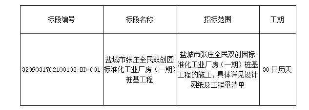 本招标项目盐城市张庄全民双创园标准化工业厂房已由盐城市盐都区发展和改革委员会以关于盐城市张庄全民双创园建设投资有限公司建设张庄全民双创园标准化工业厂房项目备案的通知-都发改审(2016)281号批准建设。招标人为盐城市张庄全民双创园建设投资有限公司,工程所需资金来源自筹。项目已具备招标条件,现对该项目的盐城市张庄全民双创园标准化工业厂房(一期)桩基工程进行公开招标。本次招标对投标报名人的资格审查,采用资格后审方法选择合格的投标申请人参加投标。