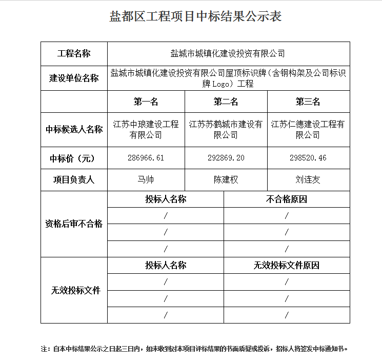 盐城市城镇化建设投资有限公司屋顶标识牌(含钢构架及公司标识牌Logo)工程中标公示