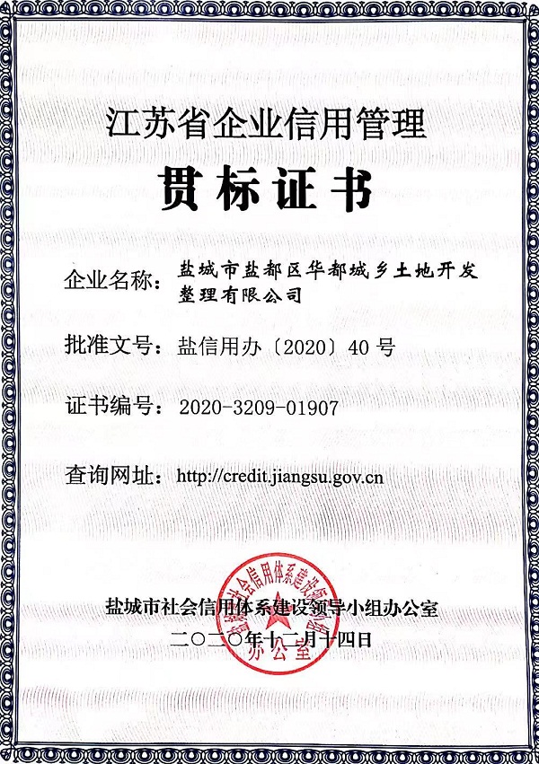 根据《“十三五”期间深入推进全省企业信用管理贯标和示范创建工作实施意见的通知》(苏信用办〔2016〕39号)和《关于组织开展2020年度企业信用管理贯标和示范创建工作的通知》(盐发改信用〔2020〕49号)要求,经企业申请、各县(市、区)推荐和第三方信用服务机构实地评价等程序,我集团子公司盐城市盐都区华都城乡土地开发整理有限公司符合2020年度省信用管理贯标企业认定标准,荣获江苏省企业信用管理贯标证书。