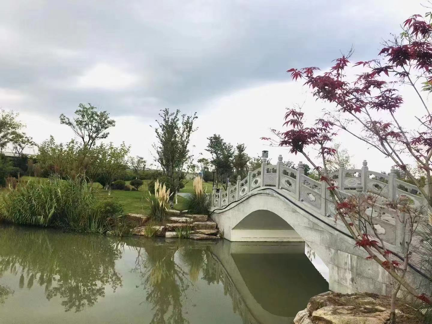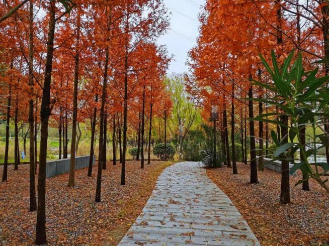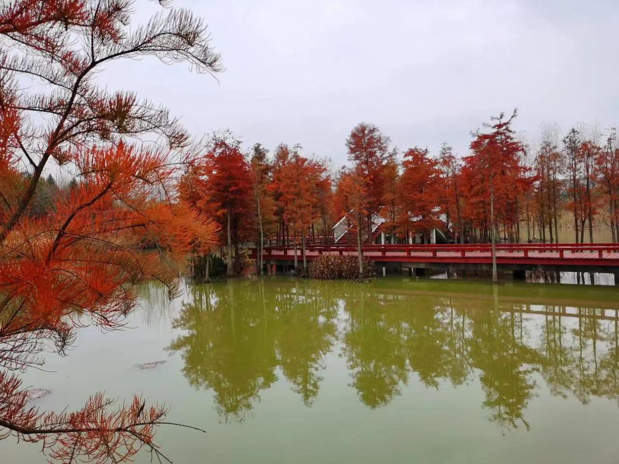 红叶衬着绿树,小桥伴着流水,既有曲径通幽之妙,也有宽阔草地之美。公园集生态休闲、观光旅游等功能为一体,游客可以在公园内拥有湿地旅游、白果采摘、户外烧烤等丰富多样的出游体验。